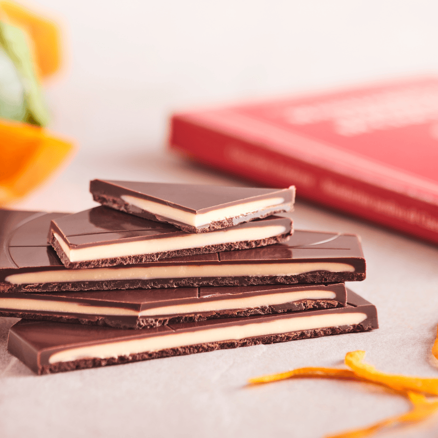 Questa tavoletta fonde perfettamente il gusto dolce del cioccolato con il delicato gusto agrumato del mandarino. L’abbinamento conquista a ogni assaggio e la “penna” che scrive questa storia di sapori è proprio il mandarino: la sua dolcezza naturale si fonde con armonia insieme alla struttura del cioccolato fondente, come una trama ben costruita.
